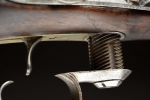 This extremely rare and historic rifle is in very good condition. All of its steel components have been polished, as is typical for firearms that were kept in England. It now retains a graying patina. The bore remains excellent with deep clear rifling. The distinctive proof marks are deep and clear. All of the engraved markings are also clear, but show some light wear from polishing. There is some light freckling around the touch hole. The flintlock and breech-loading actions are tight and function flawlessly. The stock is very good, but upon close inspection, has a period English repair around the forestock, about 13-1/2″ back and a small thin sliver replaced along the left side, about 6-1/4″ long. There is a small professionally repaired crack between the triggerguard and the lock, which is a weak spot that these rifles were notorious for having. Otherwise, the stock retains an even and pleasing patina with some scattered marks from use. The German silver furniture retains a pleasing mellow patina.