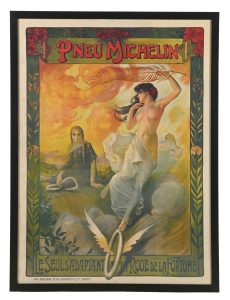 Original Michelin Tires framed poster with outstanding graphic of seminude nymph and winged tire. Circa 1920s. Size: 46½in x 62in. Estimate: $4,500-$9,000