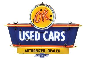 Circa-1950s OK Used Cars Authorized Dealer complete porcelain neon sign with bullnose attachments. Maker marked ‘Federal Signs.’ Side one shows excellent color and gloss throughout, with minimal light scratching and wear, and one area of touchup to lower field. Side two is equally colorful and glossy, with two touchups. Touchup to left bullnose; right bullnose outstanding throughout. Mounted on original can, which has been repainted. Accompanied by two Chevrolet porcelain bowtie attachment signs. Size: 58in x 16in x 39in. Condition: 8.5, 8.0. Estimate: $10,000-$20,000
