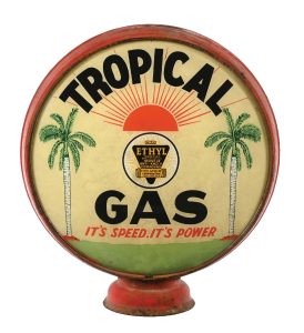 Rare Tropical Gas ‘It’s Speed It’s Power’ single 15in globe lens with attractive double-palm-tree and sunburst graphic, on original low-profile metal body. One of only two known examples of its type. Originally found in Florida complete, but subsequently split into halves. Represents unknown independent brand with no known history other than its origin being in Florida. Condition: 8.75+. Estimate: $15,000-$30,000