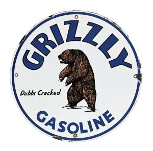 A collector favorite, this circa-1940s single-sided porcelain sign advertising Grizzly Gasoline displays the company’s hulking brown bear mascot and the phrase ‘Dubbs Cracked.’ Excellent graphic, color and gloss throughout with clean lettering. Minor chipping below and to right of mounting hole, and minor chips along outer edges. All four original grommets intact. Diameter: 12in. Condition: 8.5+. Estimate: $10,000-$20,000