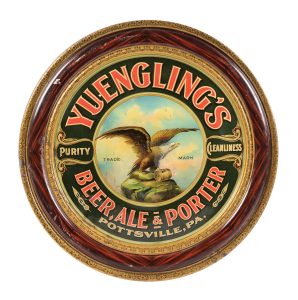 Yuengling’s Beer, Ale & Porter single-sided self-framed tin sign, circa 1900, Pottsville, Pa. Beautiful eagle graphic at center. Size: 23½in diameter. Condition: 8.0. Sold above high estimate for $15,990