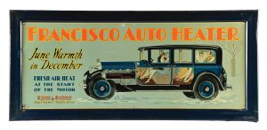 Circa-1920s single-sided tin sign for Francisco Auto Heaters with cutaway graphic showing the interior of an automobile with well-dressed passengers and emblazoned with the text ‘June Warmth in December’ and ‘Fresh Air Heat at the Start of the Motor.’ Size: 40in x 18in. Condition 8.5. Sold for $20,910 against an estimate of $3,000-$6,000