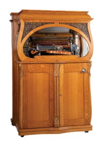 Magnificent circa-1900 Mills Novelty Co., Art Nouveau bow-front Violano Virtuoso, one of fewer than 20 of its type known to exist. Older full restoration. Beautiful quartered-oak cabinet with handsome ‘tiger’ striping. Deep, rich violin tone, perfectly-tuned piano. All keys and six rolls included. Height: 69½in. Sold within estimate for $79,950