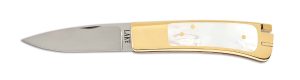 Ron Lake custom 18K gold and mother-of-pearl tail-lock knife with 2½in mirror-polished ATS-34 blade marked ‘LAKE’ and ‘Au.’ Housed in plush zipper case. VG condition with provenance from the collection of Frank Brownell. Sold for $38,400 against an estimate of $8,000-$12,000