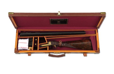 An outstanding set of five circa-1980 small-bore Francotte (Belgium) side-by-side ejector game shotguns with nominal 28-inch chopper lump barrels came complete with individual maroon canvas cases, each bearing the maker’s label. Each of the guns had an engraved skeleton butt plate, checkered wood, a mechanical single trigger on a sideplated boxlock action with sideclips, and Belgian proof marks. Also, each was gold-inlaid SAFE ahead of a small button-style safety catch. The barrels were marked AUG FRANCOTTE BREVETE A LIEGE and MADE IN BELGIUM FOR BINGHAM LTD ATLANTA GEORGIA USA, with the serial number engraved on the bottom strap. This very attractive set sold for $78,000 against a $40,000-$60,000 estimate.