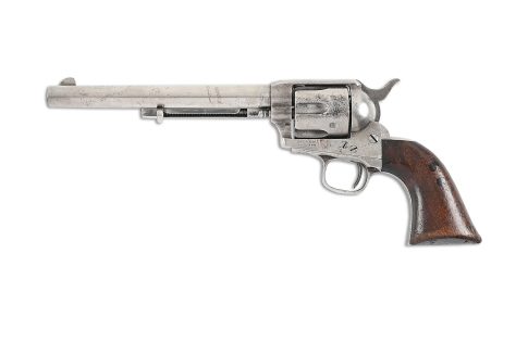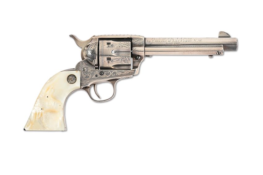 Historical silver-plated Colt .45 Single Action Army Revolver presented to Territorial Mounted Policeman Apolonio A. Sena in 1911 by citizens of Las Vegas, N.M., in gratitude for his role in capturing kidnappers of two-year-old boy. Shipped May 25, 1911 and inscribed ‘PRESENTED TO A. A. SENA BY CITZENS OF LAS VEGAS, NEW MEXICO.’ Accompanied by briefcase containing factory letters, other literature. Provenance: Ex Charles Schriner, collection of the Y.O. Ranch, Kerrville, Texas. Sold within estimate for $56,580