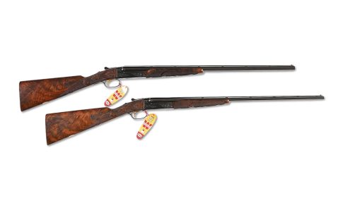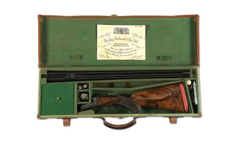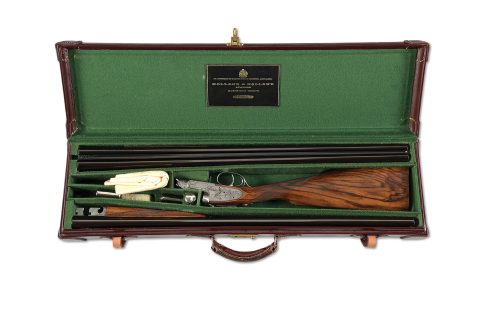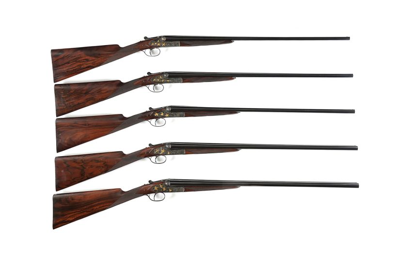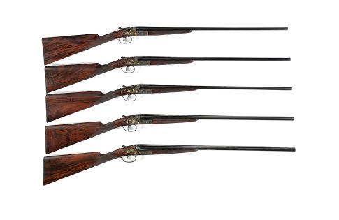 Set of five circa-1980 small-bore Francotte (Belgium) side-by-side ejector game shotguns with nominal 28in chopper lump barrels. Engraved skeleton butt plate. English stock and checkered wood. Barrels marked ‘AUG FRANCOTTE BREVETE A LIEGE’ and ‘MADE IN BELGIUM FOR BINGHAM LTD ATLANTA GEORGIA USA.’ Serial number engraved on bottom strap of each. Belgian proof marks. Each gun secured in individual maroon canvas case with maker’s label. Set sold for $78,000 against a $40,000-$60,000 estimate.