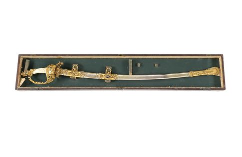 This richly embellished Staff & Field Officer’s Sword, crafted by W. Clauberg of Solingen, bears ornate gilt brass fittings, carved ivory grip, gemstone accents, and beautifully etched blade scenes. The scabbard features detailed mounts, including a diamond-studded shield and the original presentation inscription to Col. Sipes from the regiment’s supporters in Pottsville, PA. Col. William Barton Sipes led the 7th PA Cavalry through critical Civil War campaigns including Stones River, Shelbyville, Chickamauga, and the Atlanta Campaign. This sword reflects the esteem of both his regiment and community for their distinguished service. A rare and historically significant artifact in excellent condition, accompanied by its original wood storage box.