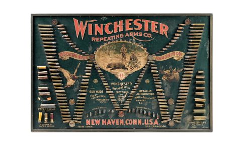 Winchester Repeating Arms Co., Double-W cartridge board, of a type distributed to dealers circa 1897. Numbered ‘245’ on verso. Display includes 200 shells, 13 bullets and 9 primer tins in an attractive arrangement. Size: 50½in x 33in. Sold for $41,820 against an estimate of $20,000-$30,000