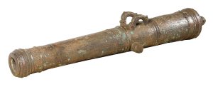1628-dated Dutch West India Company bronze cannon, 88in from muzzle to cascabel, with 5in bore that opens up toward muzzle, indicating it to be a ‘drake.’ Bronze construction further indicates it was likely a naval gun. Marked with monogram of West India Company and the letters ‘G’ and ‘O’ for Groningen and Ommelanden over the chamber. Secondary band reads ‘SICKMANS’ for manufacturer Nicolaes Sickmans. Found outside of UK waters, may have come from a ship used for what was essentially legal piracy. Sold for $61,660 against an estimate of $12,000-$18,000