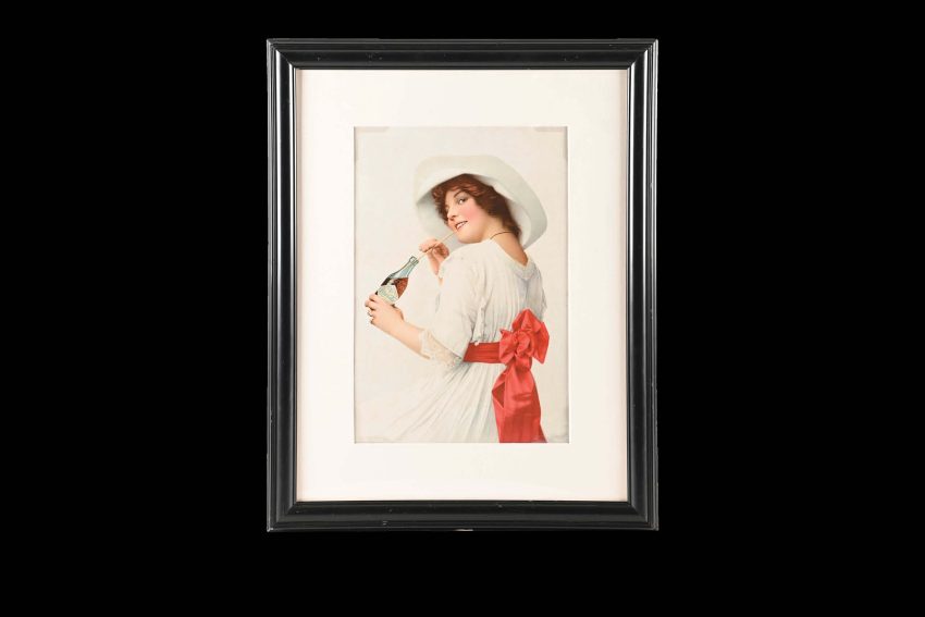 Outstanding circa 1910s-1920s single-sided printer’s proof on lithographed paper with a scene depicting a man swimming up to a dock to accept a fountain glass of Coca-Cola from his lady friend. Presumably, it would have been the basis for a die-cut cardboard window display. Framed size: 39¼in x 34¼in. Condition 9.25. Sold for $27,600 against an estimate of $10,000-$20,000