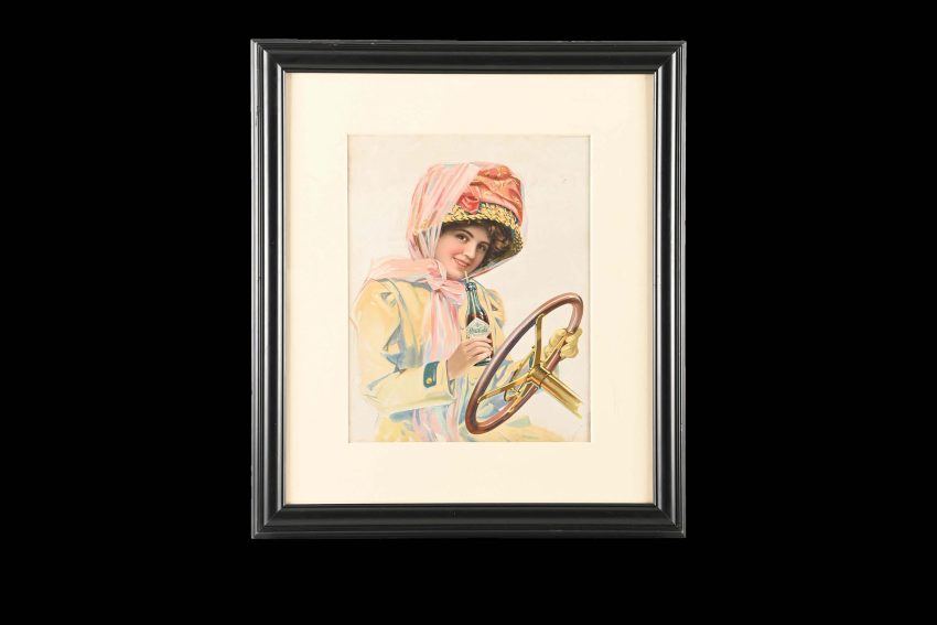 Large and impressive circa-1905 Pepsi-Cola cardboard sign with the image of ‘Miss Pepsi-Cola’ holding an early soda fountain glass. Message says ‘Drink Pepsi-Cola / Delicious / Healthful’ with the price of 5¢ ‘At Founts’ or ‘In Bottles.’ Size: 27¾in x 34¼in. Condition: 8.5. Sold at the upper end of its estimate range for $16,800