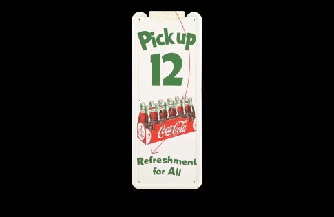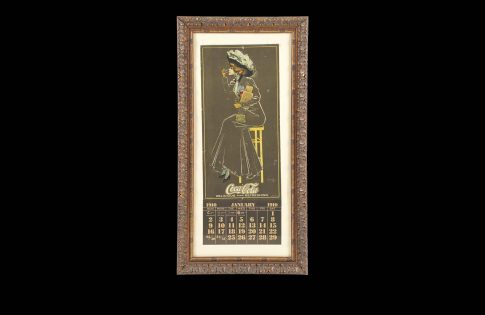 With provenance from the respected Schmidt Museum of Coca-Cola Memorabilia, a circa-1908 tin-over-cardboard sign with a Coca-Cola script logo featured an appealing graphic of a straight-sided Coke bottle with a paper label. Graded in 8.0 condition, this fine example of a seldom-encountered sign prompted a winning bid of $14,760 against an estimate of $4,000-$8,000.
