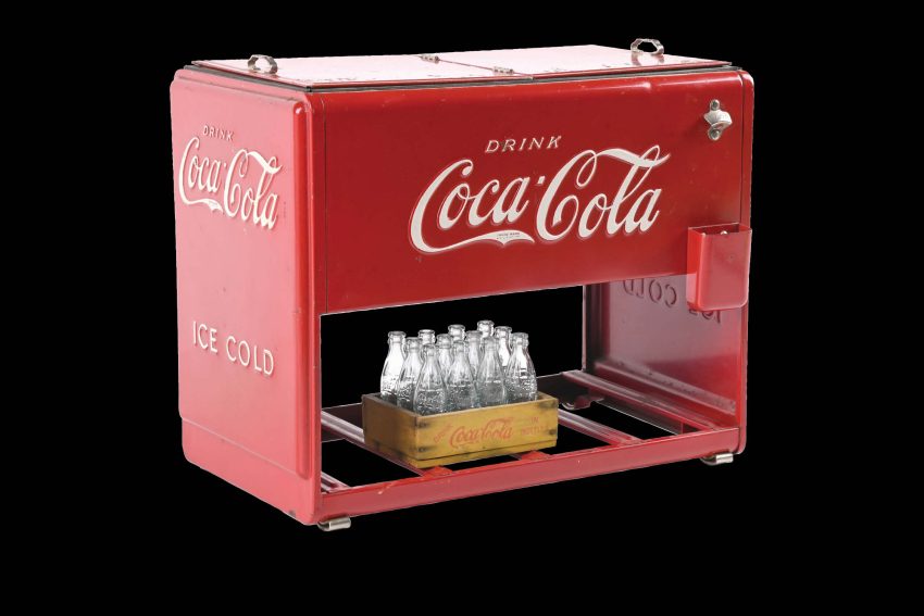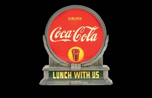 Also harkening to the days when the local soda fountain was the place for socializing, a circa-1905 Pepsi-Cola “The Pepsin Drink” tip tray proved to be small but mighty. Six inches in diameter, with an early script logo and the maker’s name The Meek & Beach Co., Coshocton, O, it was AGS-graded 85 and sold for $27,060 against an estimate of $6,000-$12,000. Meanwhile, from behind the soda fountain counter, a gorgeous circa 1900-1910 ceramic Pepsi-Cola syrup dispenser presented in 8.25 condition. Ornately decorated in Art Nouveau style and complete with its original spigot and lid, it sold above its high estimate for $19,680.