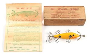 Earliest iteration of a Heddon 1300 Musky Sucker bait, dating to 1913, with original ‘Sucker’ finish, heavy-duty hardware, perfect glass eyes, a marked front prop, and four belly weights. Accompanied by correct factory box with label depicting the company’s iconic ‘Downleaping Bass.’ Length: 5¾in. Sold for $11,000 against an estimate of $5,000-$10,000