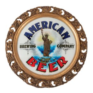 Gorgeous circa-1891 American Brewing Company (Pocatello, Idaho) circular beer advertising sign, reverse-painted on glass with central image of the Statue of Liberty standing atop the earth. Marked for Dawe’s Mfg. Co., Pittsburgh, Pa. Patriotic colors with gold-leaf lettering accents. Original gilt gesso frame. Size: 24¼in diameter. Condition: 9.0. Estimate: $15,000-$30,000