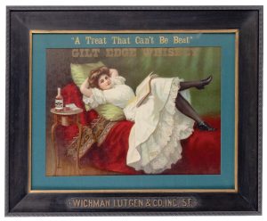 Wichman Lutgen & Co. Inc., San Francisco lithographed advertisement for Gilt Edge Whiskey, ‘The Treat That Can’t Be Beat,’ featuring the brand’s iconic Victorian lady. Both frame and matting are original. Size: 32in x 26in. Condition 9.0+. Estimate: $15,000-$25,000