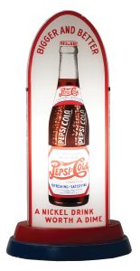 Beautiful illuminating reverse-on-glass Pepsi-Cola bullet sign with the message ‘BIGGER AND BETTER / A NICKEL DRINK WORTH A DIME.’ TAC-authenticated with no areas of repair. Original base and backing, showing remnants of the original decals. Fully operational with original cord. Height: 14in. Condition 9.0. Estimate: $5,000-$15,000