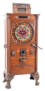 A fantastic array of coin-operated machines awaits bidders, including gambling, vending and music machines of the highest caliber. A Mills Novelty Co. (Chicago) 5¢ Dewey Jackpot slot machine with a front-glass graphic and copper flash castings is housed in a quartered oak cabinet (replaced back door). It appears to have undergone a restoration in its earlier days. The unit has original castings (with the exception of doghead castings), and the front glass is an older replacement with lustrous lettering. The colorful tin-litho wheel is in excellent condition. In VG condition, its auction estimate is $10,000-$20,000.