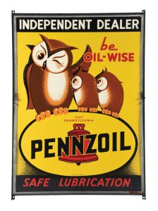 Circa-1950s single-sided tin sign advertising Pennoil with appealing image of owl teaching two owlets to ‘be OIL-WISE.’ Excellent color and shine. Size: 48½in x 34¼in. Sold for $11,685 against an estimate of $800-$1,600