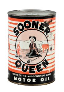 Rare circa-1950s Sooner Queen Motor Oils (Salyer Refining Co., Oklahoma City) 1-quart can imprinted with 35¢ price and graphic of cowgirl beside campfire with steer and mountains in background. Full contents and clean seam. AGS-certified and graded 85. Sold above high estimate for $6,150