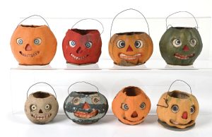 A toothsome collection of 8 Halloween jack-o-lanterns in various colors with a variety of expressions sold for $9,225 against an estimate of $1,200-$2,500