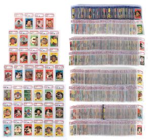 Complete set of 1959 Topps baseball cards. Total of 572 cards, approximately 80% of which have already been graded, with highlights such as Willie Mays All-Star card No. 563 in PSA Mint 9 condition and approximately 35 Hall of Famers in PSA NM to Mint 8 condition, including No. 10 Mickey Mantle and No. 514 Bob Gibson rookie card. Sold well above high estimate, for $67,650
