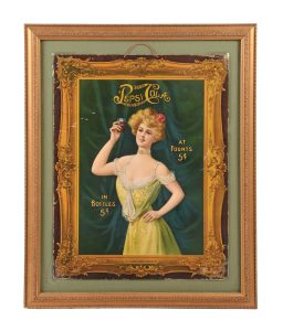 Large and impressive circa-1905 Pepsi-Cola cardboard sign with the image of ‘Miss Pepsi-Cola’ holding an early soda fountain glass. Message says ‘Drink Pepsi-Cola / Delicious / Healthful’ with the price of 5¢ ‘At Founts’ or ‘In Bottles.’ Size: 27¾in x 34¼in. Condition: 8.5. Estimate: $10,000-$20,000