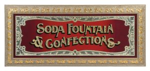Stunning example of reverse-painted and foil-under-glass sign reading ‘SODA FOUNTAIN & CONFECTIONS.’ Field is clean and glass is undamaged. Presented in a later custom-made frame. Size: 64in x 28in (framed). Condition 9.0. Estimate: $4,000-$12,000