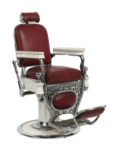 Beautifully-detailed salesman’s sample barber chair from Theo A. Kochs, with red leather cushions, white porcelain, and chrome construction. Extraordinary attention to detail. Company name de-embossed onto both footrest sections. Chair swivels back and forth, although it does not lift when hand pump is used. Size: 8¼in x 12½in x 16in. Condition: 8.75+. Estimate: $15,000-$30,000
