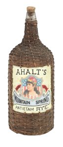 Large, late 1890s or early 1900s Ahalt’s Pure Old Mountain Spring Antietam Rye label under glass wicker bottle with handle, 16½ inches tall, graded at 8.25 for condition, $30,750