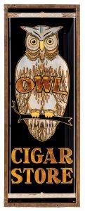 Late 19th/early 20th century Owl “Cigar Store” reverse-painted glass sign, one of the best reverse-painted glass signs known to exist, 30¼ inches by 80 inches, in a frame, $68,880