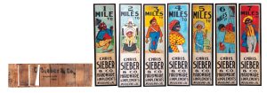 A complete set of seven Ithaca tin mileage signs for Sieber Hardware, with the original shipping crate marked for the same Sieber Hardware and Implements Store in Woodland, California, breezed past the $40,000 high estimate to realize $54,120. This would be an impossible set of Ithaca signs to locate individually, and these examples displayed great color and graphics. It was truly an amazing set of early Black Americana advertising.
