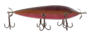 The revered Heddon brand is amply represented in the sale. A 7¾-inch-long Heddon 747 presents in a coveted, uncataloged special-order color of blended red and purple. Not found in any standard Heddon catalog, this lure was offered exclusively by VL&A for one year (1917) as the “Dowagiac Mascallonge Minnow.” It is one of very few known examples and is graded Excellent, placing it among the finest of very few known examples. At auction, it is expected to reach $35,000-$50,000.