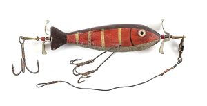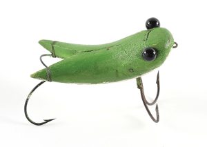Antique lures of extraordinary rarity – many of them boxed – include one of eight frogs hand-carved in 1898 by James Heddon and displayed at Heddon factory in Dowagiac, Michigan
